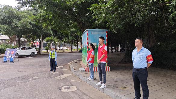清晨,茂行置地公司志愿者早早等候在兴义中学考点入口处,通过配合交警开展对考点周边的交通以及对随意鸣笛车辆进行文明劝导、安全巡逻志愿服务,为考生入场疏导交通、维持秩序,让广大考生能够第一时间安全进入考场。