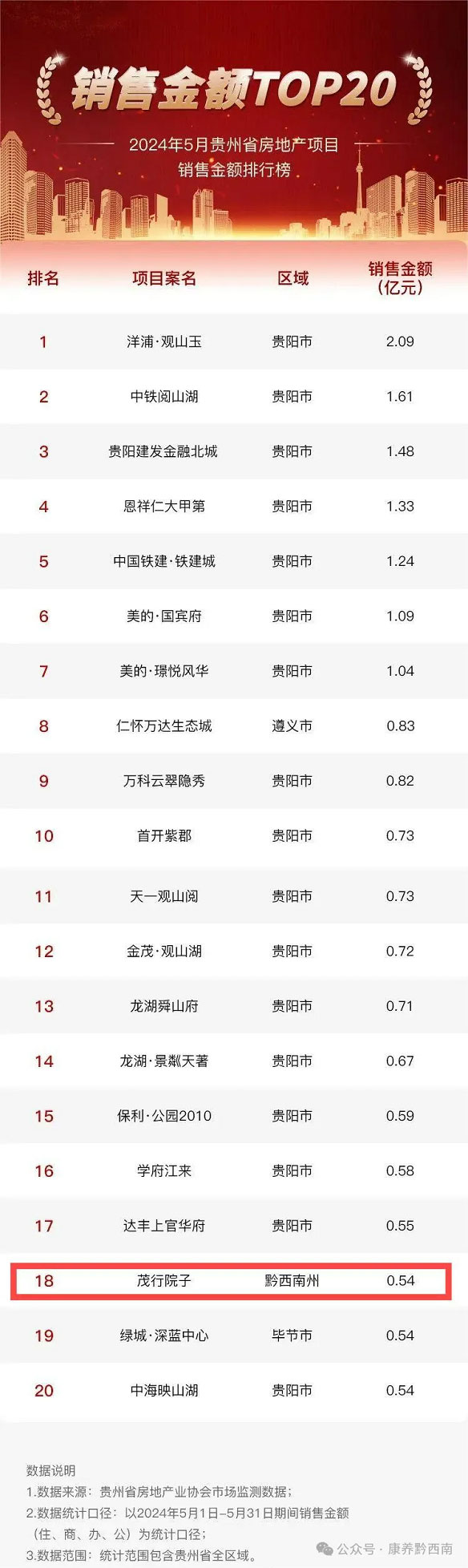 从区域分布来看,贵阳市有17个房产项目入围月度销售金额20强,遵义市有1个房产项目仁怀万达生态城上榜,黔西南有1个房产项目兴义市茂行院子上榜,毕节市有1个房产项目绿城·深蓝中心上榜。